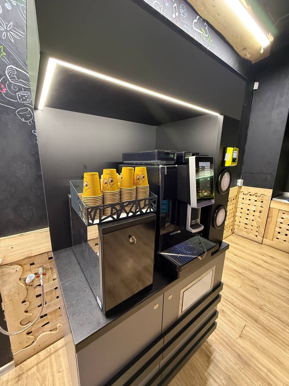 Компактна та практична стійка на якій без проблем поміщається кавомашина та органайзер з сиропами. Вмонтована LED підсвітка, 2 диспенсери під стакани, Відсік для води та зливу. Отвір для стаканів та сміття. Відсік для кави та розхідників. Всі дверцята тумби на замках.