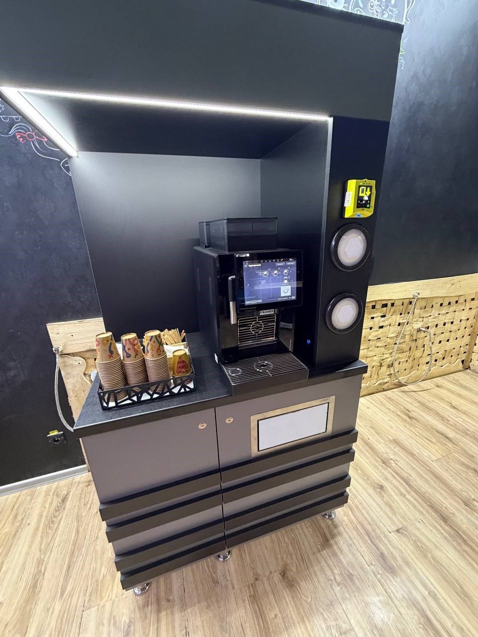 Компактна та практична стійка на якій без проблем поміщається кавомашина та органайзер з сиропами. Вмонтована LED підсвітка, 2 диспенсери під стакани, Відсік для води та зливу. Отвір для стаканів та сміття. Відсік для кави та розхідників. Всі дверцята тумби на замках.
