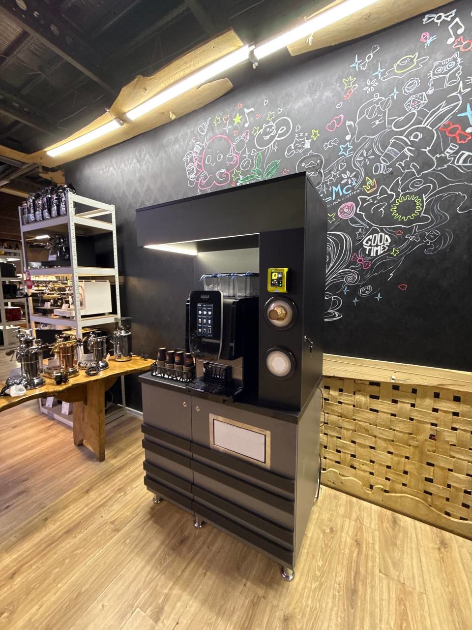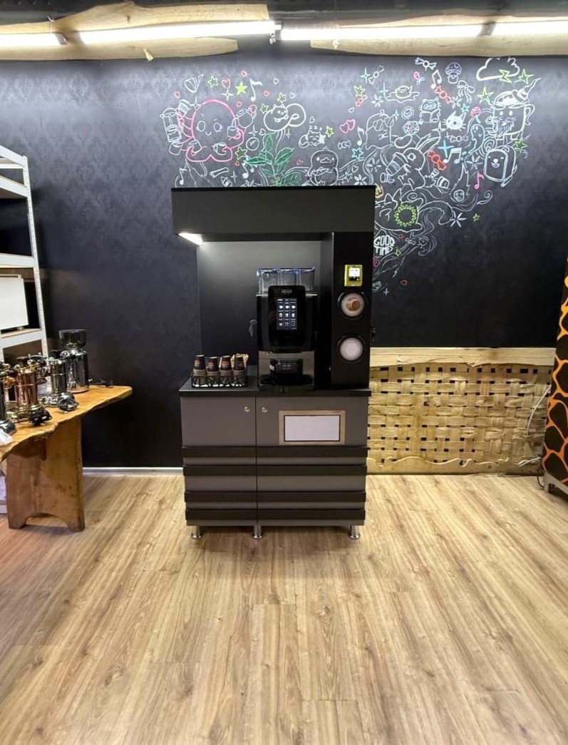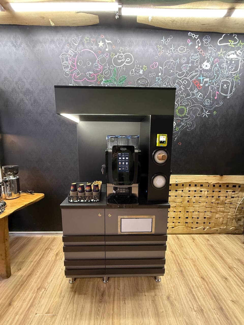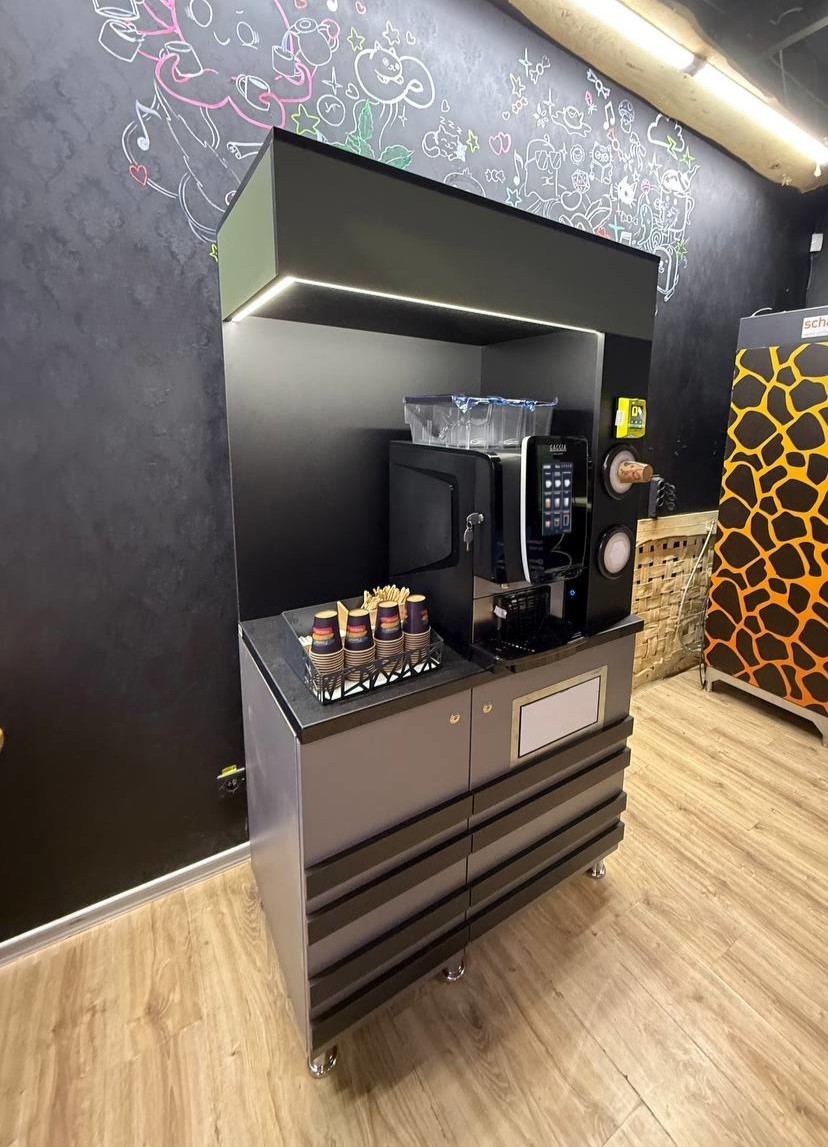 Компактна та практична стійка на якій без проблем поміщається кавомашина та органайзер з сиропами. Вмонтована LED підсвітка, 2 диспенсери під стакани, Відсік для води та зливу. Отвір для стаканів та сміття. Відсік для кави та розхідників. Всі дверцята тумби на замках.