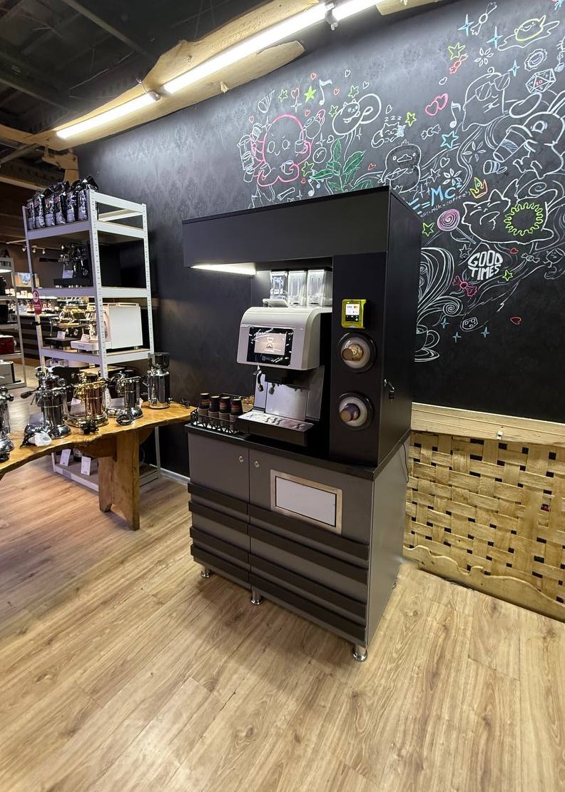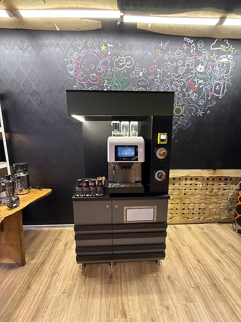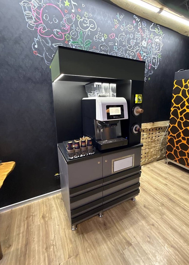 Компактна та практична стійка на якій без проблем поміщається кавомашина та органайзер з сиропами. Вмонтована LED підсвітка, 2 диспенсери під стакани, Відсік для води та зливу. Отвір для стаканів та сміття. Відсік для кави та розхідників. Всі дверцята тумби на замках.