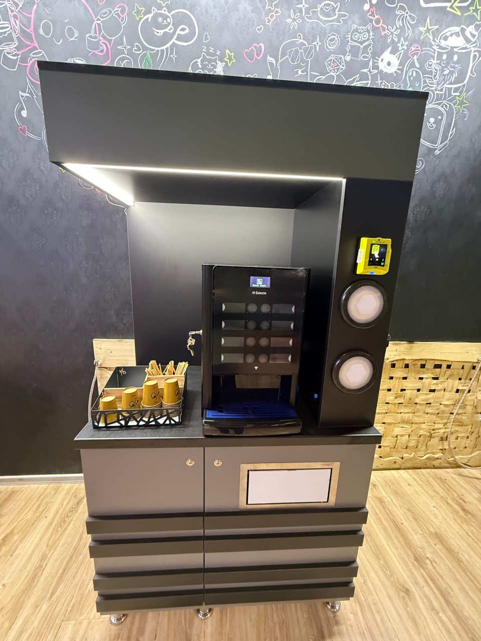 Компактна та практична стійка на якій без проблем поміщається кавомашина та органайзер з сиропами. Вмонтована LED підсвітка, 2 диспенсери під стакани, Відсік для води та зливу. Отвір для стаканів та сміття. Відсік для кави та розхідників. Всі дверцята тумби на замках.