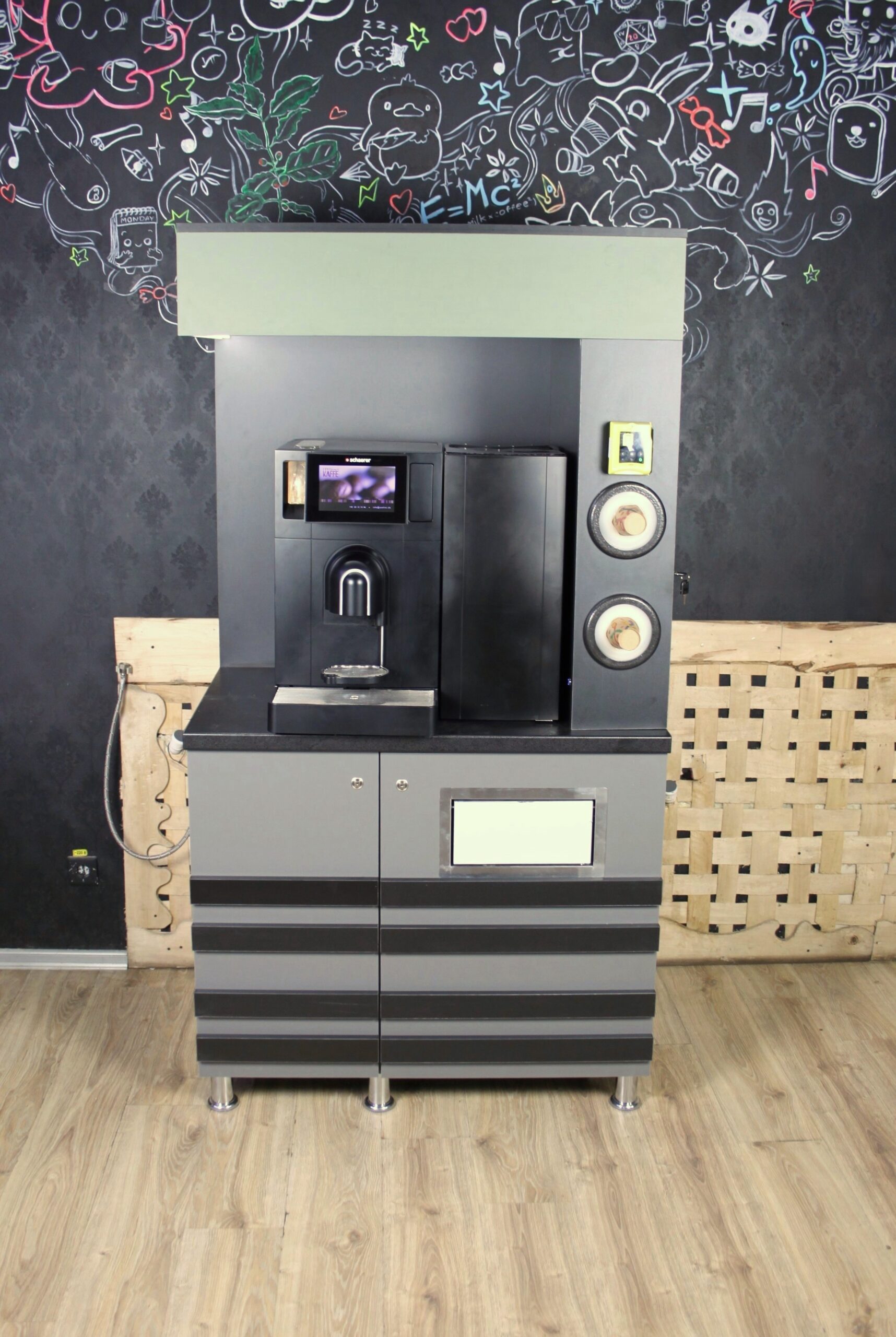 Компактна та практична стійка на якій без проблем поміщається кавомашина з холодильником та органайзер з сиропами. Вмонтована LED підсвітка, 2 диспенсери під стакани, Відсік для води та зливу. Отвір для стаканів та сміття. Відсік для кави та розхідників.